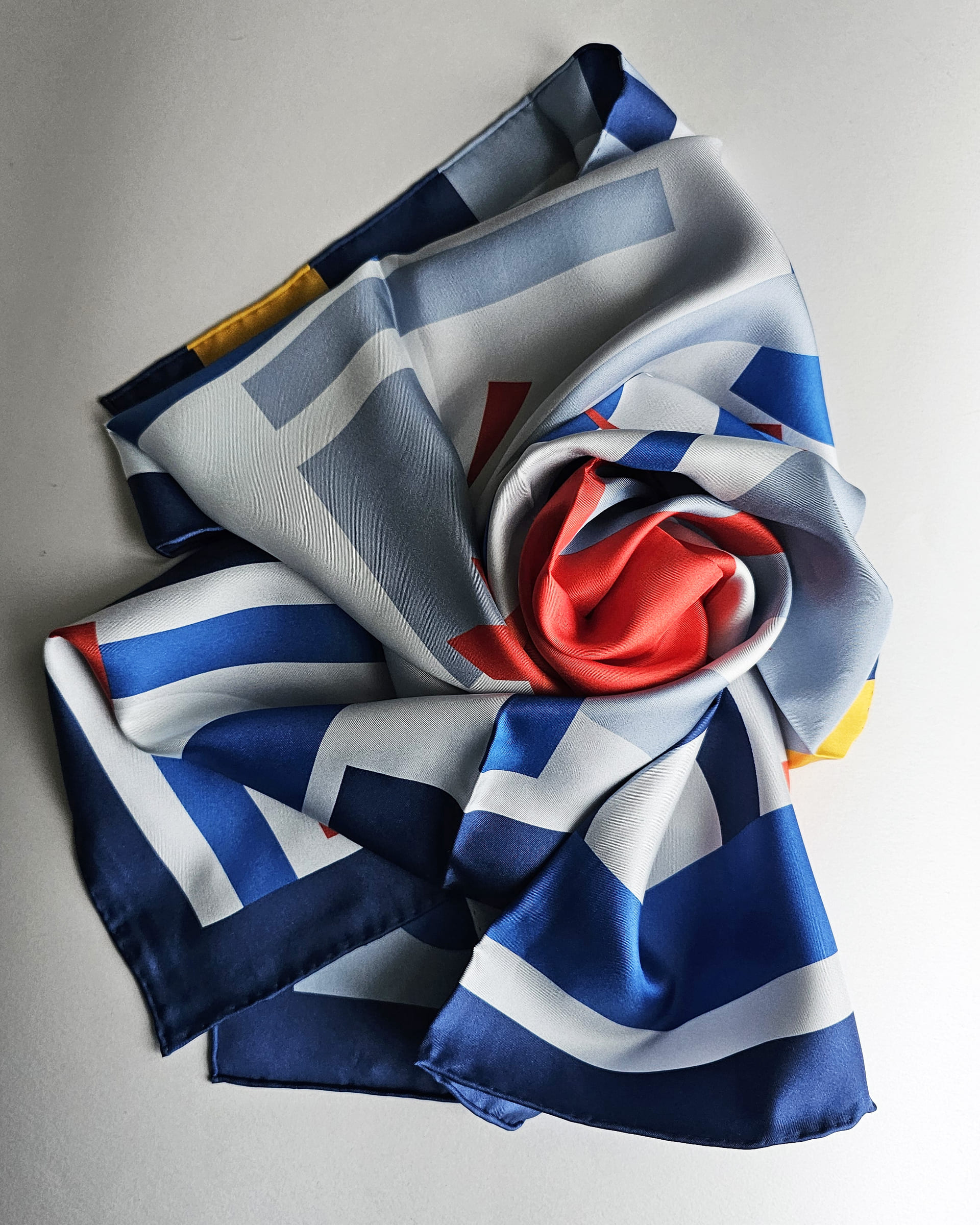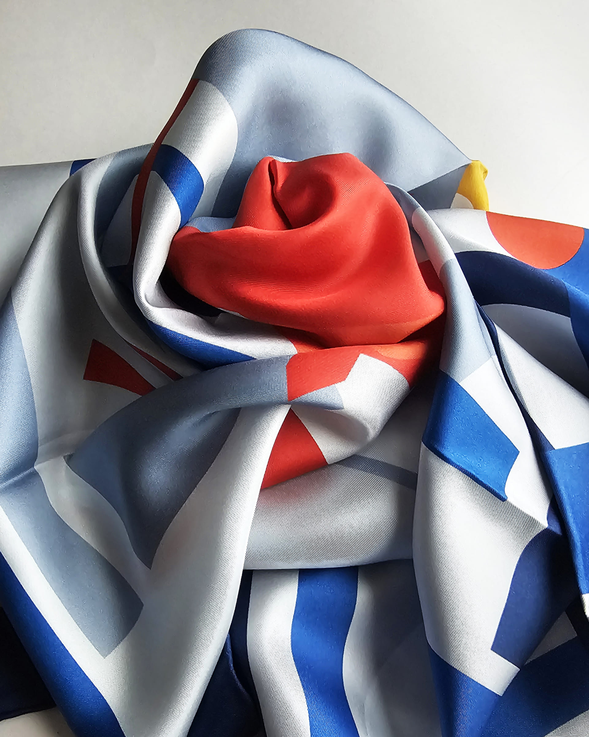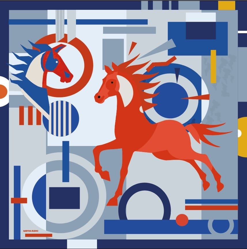 Дух Огненной Лошади, выраженный на языке супрематизма Казимира Малевича. Космическая глубина синего, бесконечное пространство белого, энергия желтого и смелый красный акцент.